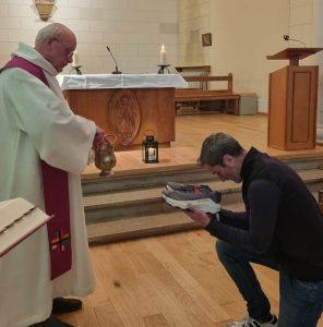 Moment important pour Damien : la bénédiction de ses chaussures par le père Pascal Harmel, salésien, aumônier de ND des Minimes.